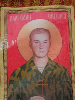 Aleksandr Makeyev, a paratroop officer who heads a foundation to assist soldiers, said he had seen soldiers kneeling in prayer before an image of Evgeny. ”The kids in Chechnya feel they've been abandoned by the state and abandoned by their commanders,” he told the newspaper Moskovsky Komsomolets. ”They don't know who to appeal to for help, but they understand that Zhenya is one of them,” he said, using Evgeny's nickname. ”You can say he is the first soldier-saint.”
